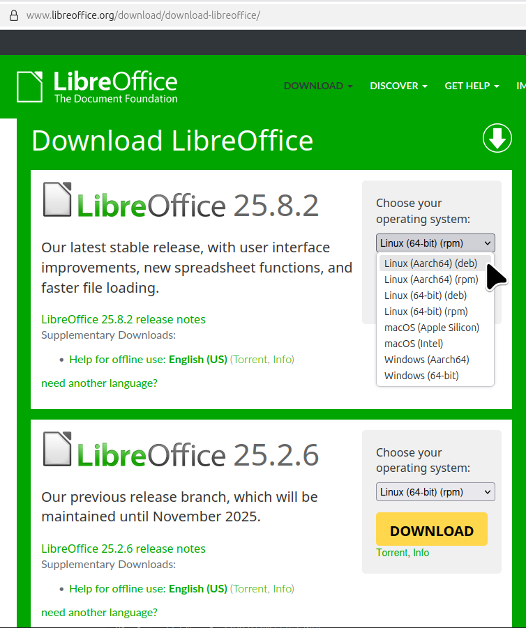 However, LibreOffice 25.8 has official support for a DEB installation file for the AArch64 architecture on Linux, as shown in the following screenshot from the Download LibreOffice page.
