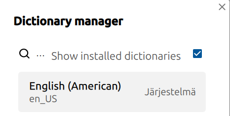 Yes, the system language is Finnish. Show installed dictionaries language is English (American). And there is no option for Finnish in Dictionary Manager.